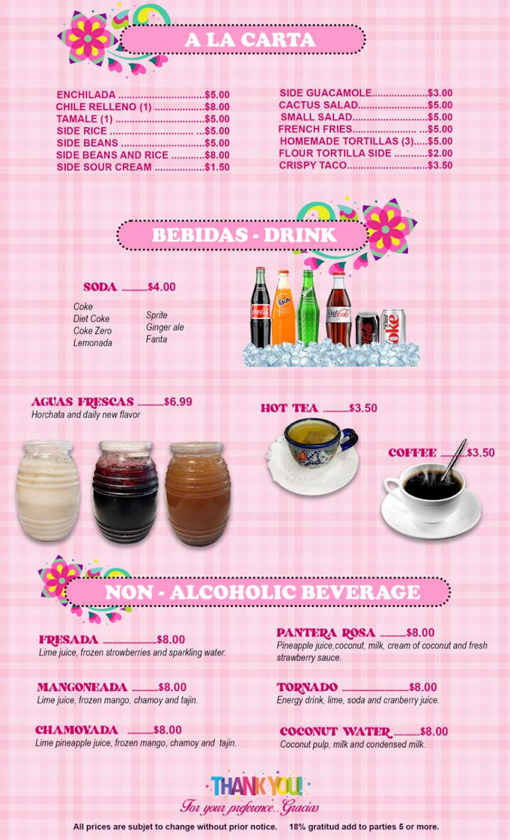 Salad lovers will enjoy the Taco Salad, crafted with a crispy shell and a selection of fresh toppings that will make your taste buds dance. Not to be overlooked, the drinks menu boasts refreshing options like the Mangonada and Pandy Pantera Rosa, perfect for pairing with any meal.